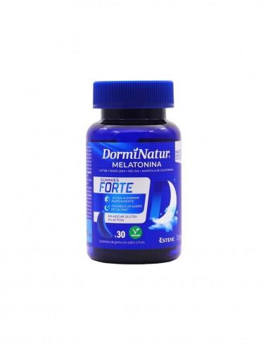 Dorminatur Gummies Forte es un complemento alimenticio en formato de 30 caramelos de goma con sabor a fruta, diseñado para favorecer un descanso nocturno reparador. Su fórmula combina melatonina, que ayuda a reducir el tiempo necesario para conciliar el sueño, con extractos de plantas como valeriana, melisa y amapola de California, conocidas por sus propiedades relajantes. Ideal para adultos que buscan mejorar la calidad del sueño de forma natural y sin crear dependencia. Se recomienda tomar un caramelo al día, preferiblemente media hora antes de acostarse. No apto para menores de 12 años, mujeres embarazadas o en periodo de lactancia sin supervisión médica.