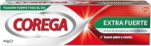 - La crema fijadora para prótesis dentales Corega Extra Fuerte proporciona una fijación fuerte todo el día